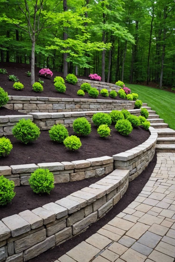 Natural stone retaining walls stack granite, limestone, or fieldstone without mortar for a dry-laid structure. Stability arises from stone weight and friction between irregular surfaces. The use of natural stone creates a timeless, classic look that works well in both formal and informal garden settings. Stone walls are celebrated for their durability and minimal visual intrusion, blending seamlessly with the natural surroundings.