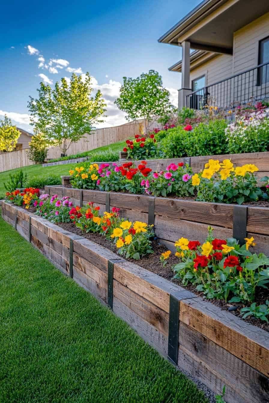 Crosstie retaining walls use stacked railroad ties or large timber beams secured horizontally by rebar spikes. They provide strong gravity resistance and a distinctive linear design. Crosstie walls invoke a sense of industrial charm and sturdy construction and are often used to create a defined separation between different landscape zones.